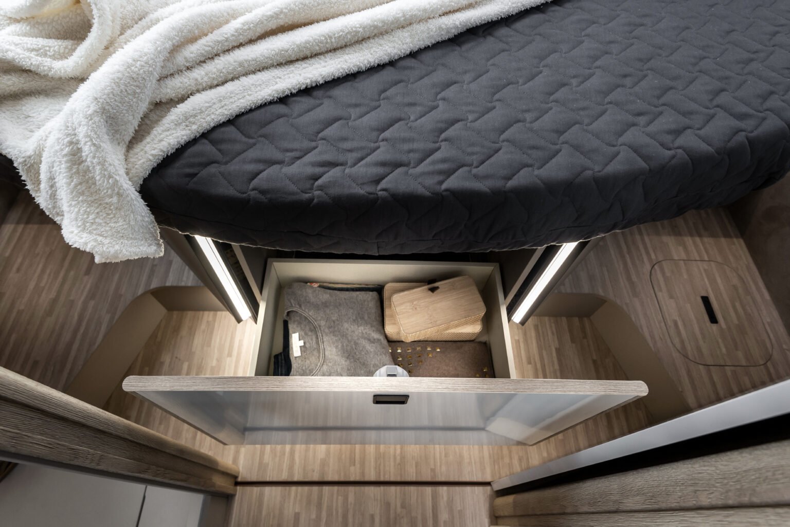 Deux tables de chevet, des armoires suspendues et des marches latérales avec des compartiments cachés : chaque centimètre est exploité au mieux. Au pied du lit, des tiroirs et un compartiment en dessous vous offrent un espace supplémentaire et vous permettent de ranger des couvertures, des vêtements et des objets volumineux. Les marches latérales facilitent l’accès et cachent des compartiments de rangement.